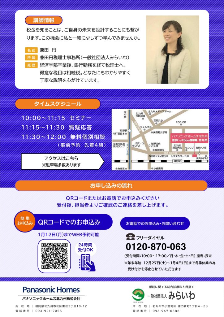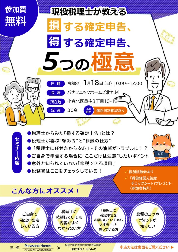 当社が参加している一般社団法人みらいわ と パナソニックホームズ北九州 主催で、【現役税理士が教える「損する確定申告、得する確定申告、5つの極意」】セミナーを開催します。(賃貸不動産をお持ちのオーナー様向けセミナーです)