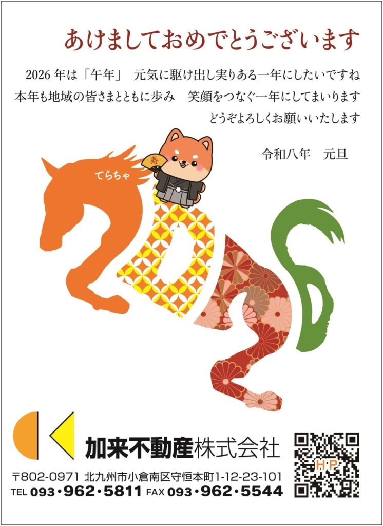 2026.1.1 あけまして おめでとうございます あけましておめでとうございます 2026年は「午年」 元気に駆け出し実りある一年にしたいですね 本年も地域の皆さまとともに歩み 笑顔をつなぐ一年にしてまいります どうぞよろしくお願いいたします 令和八年 元旦 加来不動産株式会社スタッフ一同